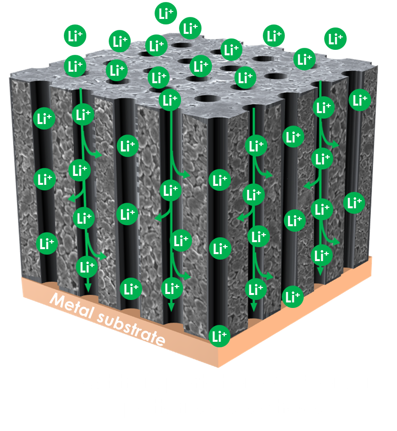 Our 3D PAD (3-Dimensional Pore Array Diagram) electrode creates uniform channels for lithium ions, controlling dendrite growth and directing expansion within the electrode. This innovative design reduces short-circuit risk, provides more space for lithium expansion, and ensures safer, longer-lasting battery performance.